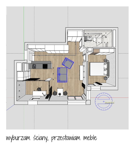 Rysuję układ pomieszczeń uwzględniając wcześniej omówioną funkcjonalność, często przygotowuję 2 lub 3 wersje a później omawiamy wspólnie, które rozwiązanie najtrafniej odpowiada Waszym potrzebom. UKŁAD FUNKCJONALNY, oprócz układu pomieszczeń, uwzględnia umiejscowienie zabudów meblowych i mebli ruchomych, sprzętów, przyłączy, punktów oświetleniowych. Na tym etapie możemy obejrzeć model 3D mieszkania.